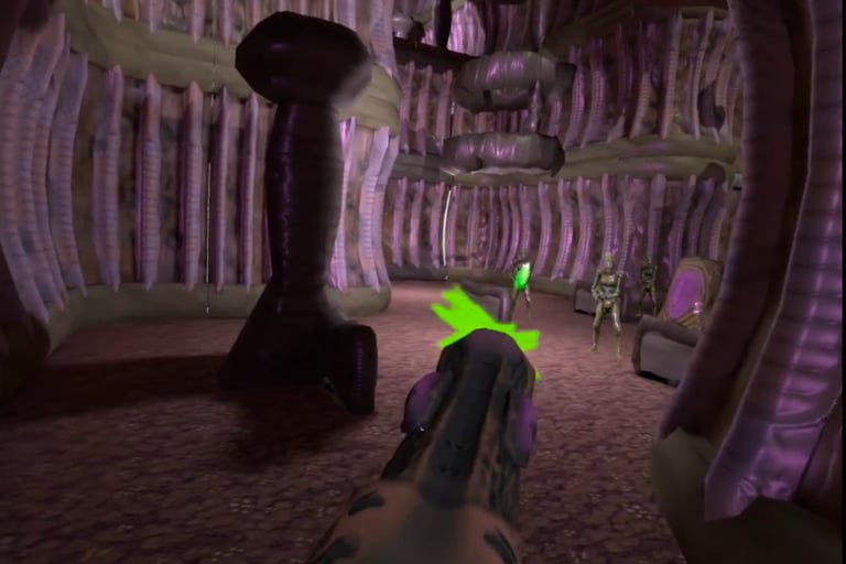 Face Disgusting looking aliens in an immersive physics based virtual reality Shooter.